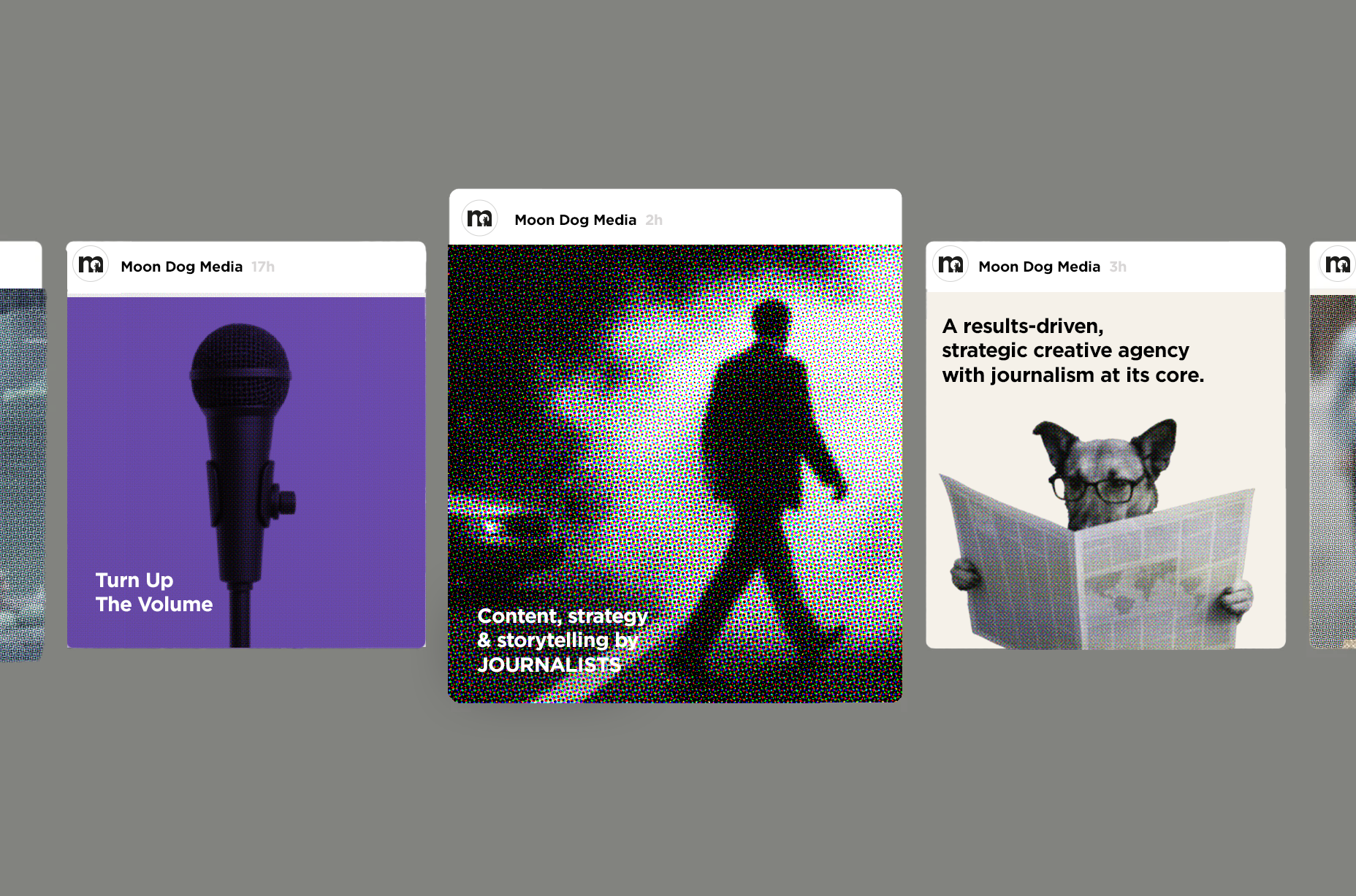the solution: The bright and cheerful colour palette has been chosen to grab attention from the audience and to stand out. The font is clean, accessible, and gives a contemporary feel. It’s welcoming, informative, and fits well with the cutting-edge native content offered at Moon Dog Media.